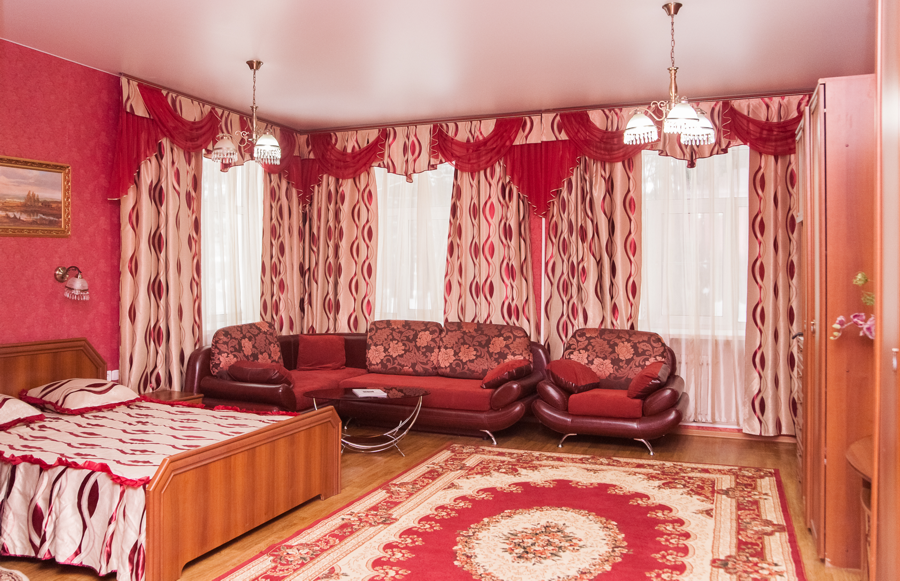 2 осн. места. 1 доп. место. Мебель: вешалка, диван раскладной, зеркало, комод, кресло, кровать двуспальная, прикроватные тумбочки, стол, стулья, шкаф. Оборудование: гладильная доска, микроволновая печь, набор посуды, сейф, сушилка для белья, телевизор, телефон, утюг, холодильник, электрочайник. Санузел: с ванной или душевой кабиной, тапочки, туалетные принадлежности, фен, халат. Сервис: Wi-Fi бесплатно, смена полотенец, смена постельного белья, уборка номера.