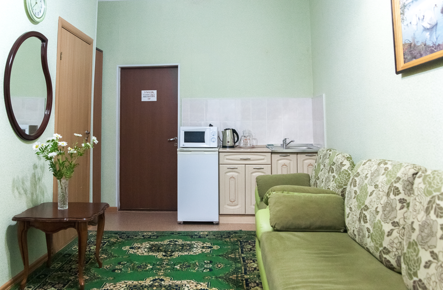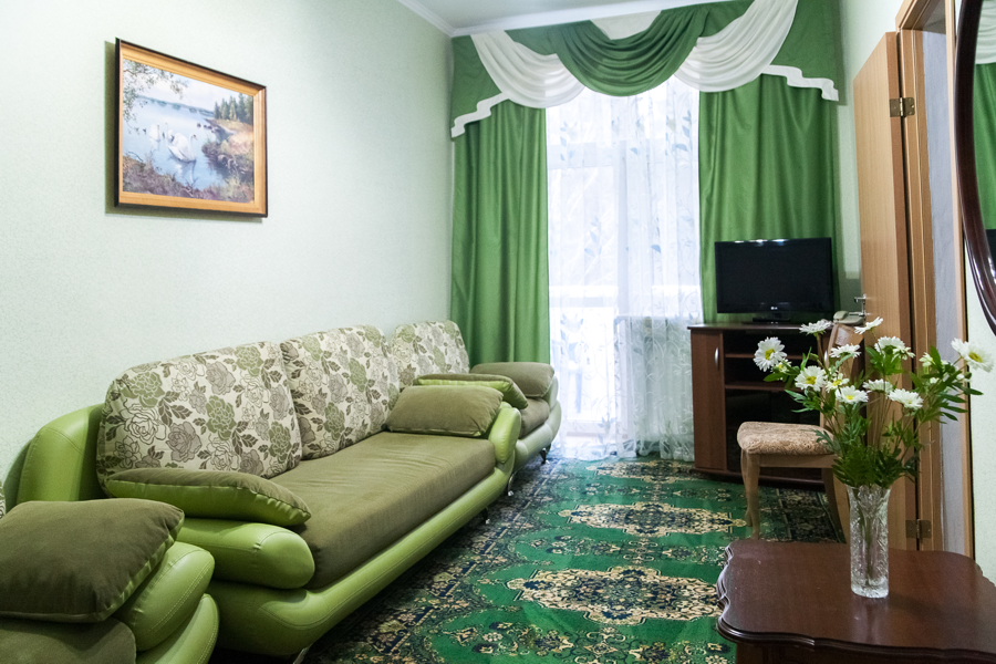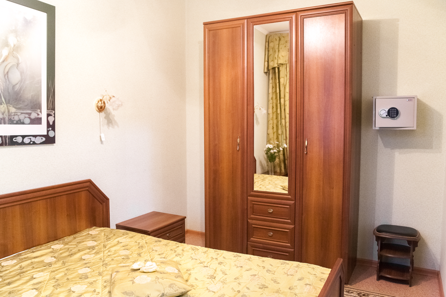 2 осн. места. 1 доп. место. Мебель: вешалка, диван раскладной, зеркало, комод, кресло, кровать двуспальная, кухонная мебель, прикроватные тумбочки, стол, стулья, шкаф. Мини-кухня. Оборудование: гладильная доска, микроволновая печь, набор посуды, сейф, сушилка для белья, телевизор, телефон, утюг, холодильник, электрочайник. Санузел: с ванной или душевой кабиной, тапочки, туалетные принадлежности, фен, халат. Сервис: Wi-Fi бесплатно, смена полотенец, смена постельного белья, уборка номера.