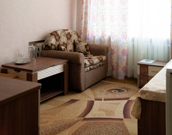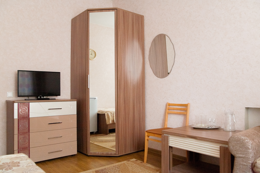 1 осн. место. 1 доп. место. Мебель: вешалка, зеркало, кровать односпальная (или двуспальная), прикроватная тумбочка, стол, стул, шкаф. Оборудование: набор посуды, сушилка для белья, телевизор, холодильник. Санузел: с душем или ванной, туалетные принадлежности, фен. Сервис: Wi-Fi бесплатно, смена полотенец, смена постельного белья, уборка номера.
